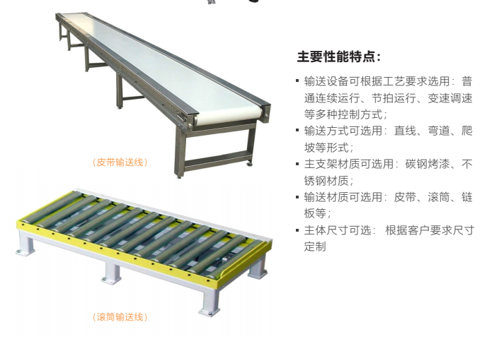输送材质可选用:皮带、滚筒、链板等;